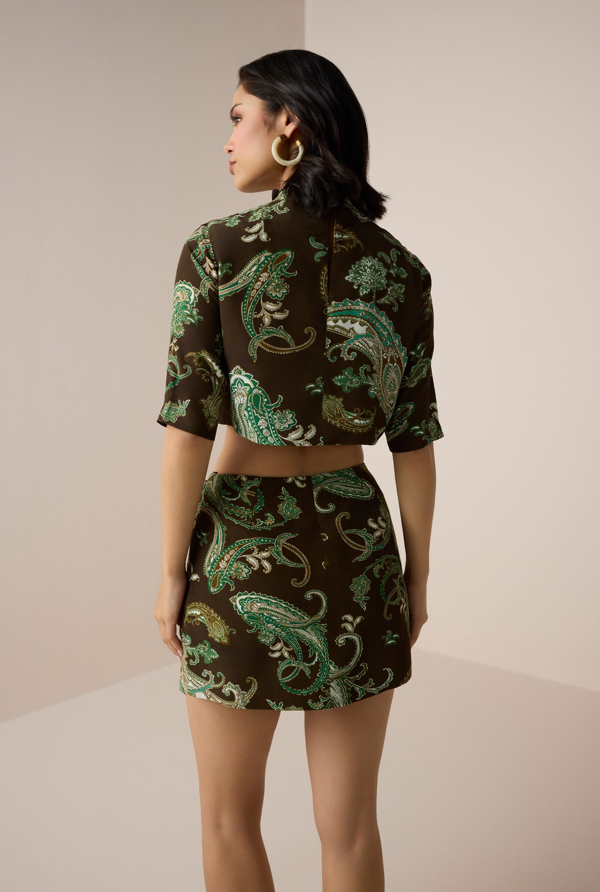 Boho chic with a modern charm, the Dira Crop Top from our Fall ’25 Collection is crafted in soft viscose crepe and adorned with a timeless paisley print in a deep, earthy brown palette. The mock neck and short sleeves lend structure to the easy-fit silhouette, while a delicate keyhole button closure at the back adds a subtle finish. Pair it with the Dira Mini skirt for a relaxed yet elevated fall look.
