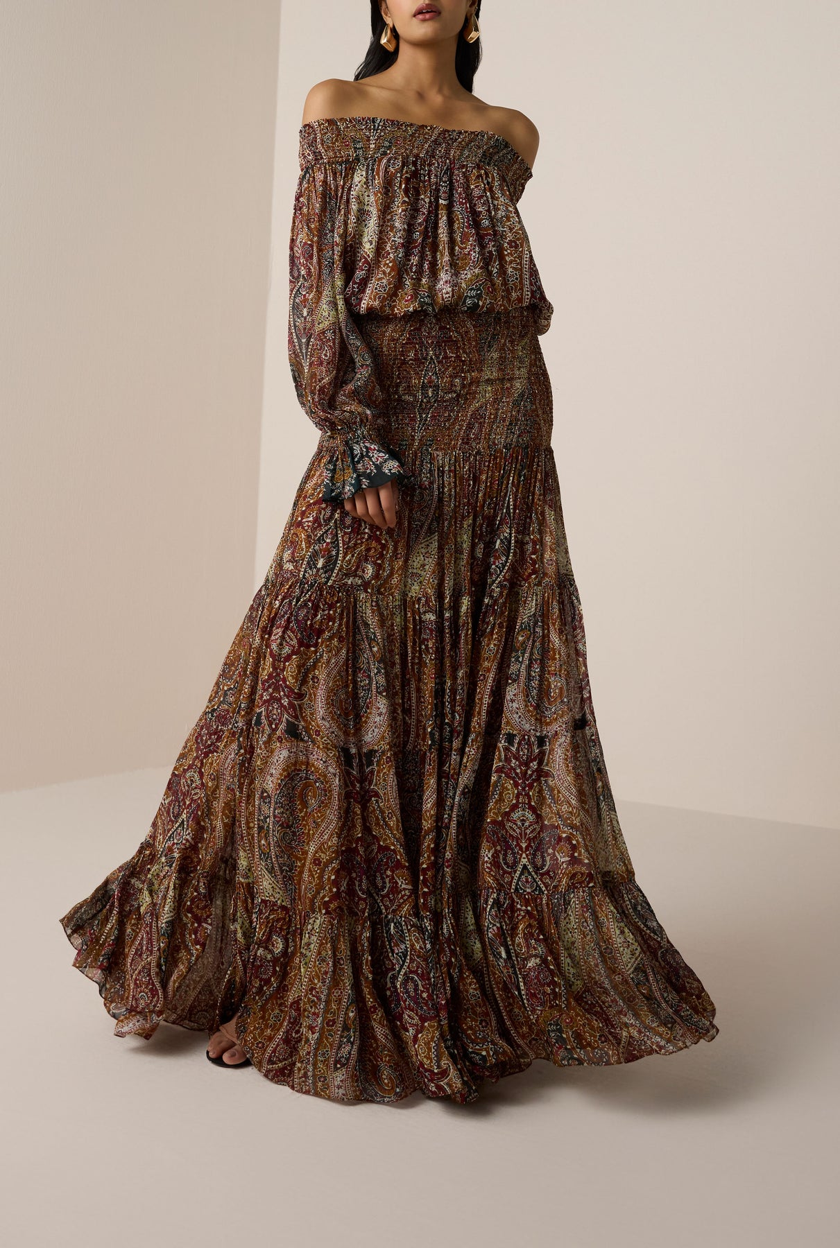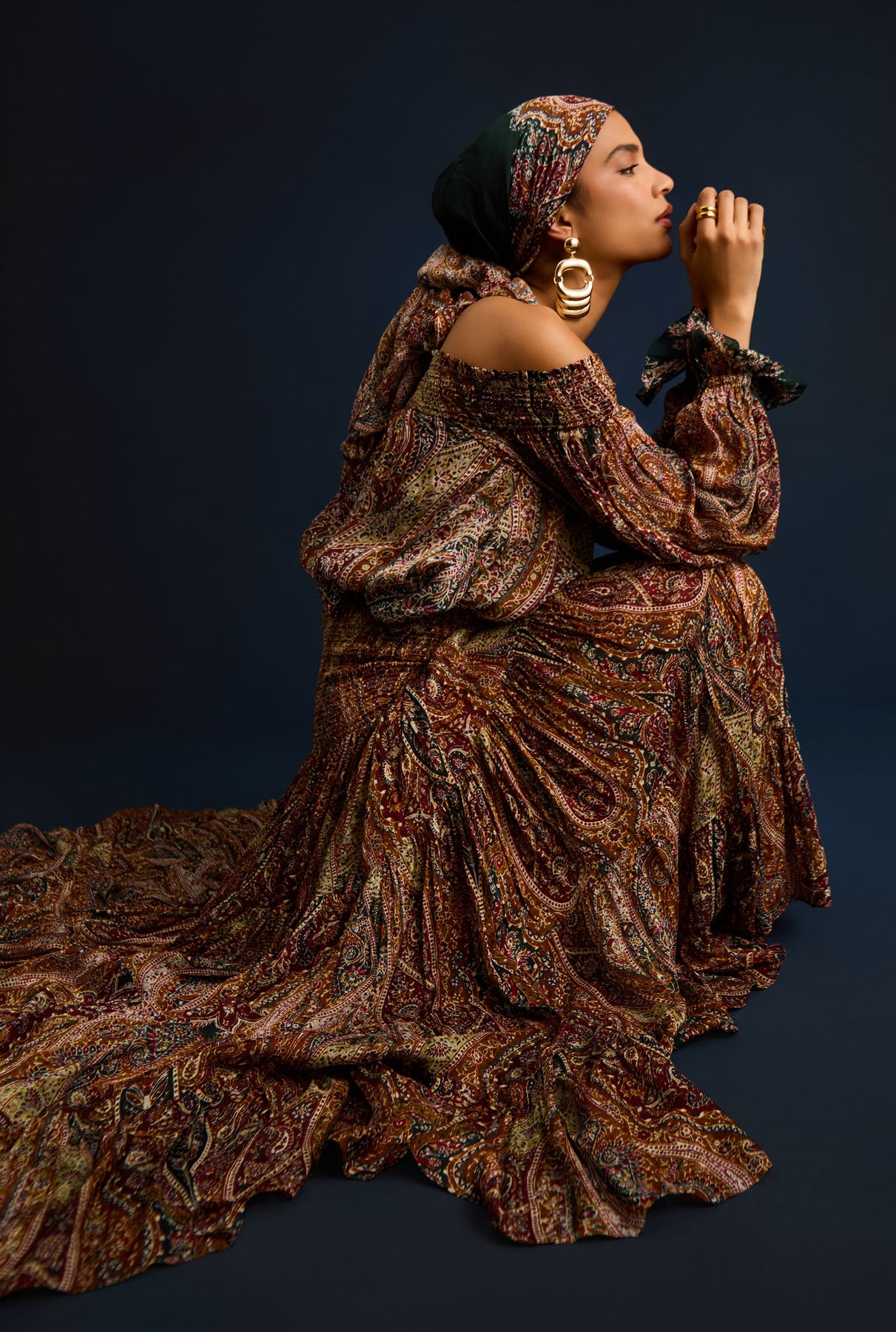 Ease into autumn with the Ruza Smocked Waist Maxi Skirt from our Fall ’25 Collection. Crafted in lightweight viscose chiffon, this striking style is brought to life with an elegant Jamawar print in rich green tones. Designed with a comfortable smocked waistband and a softly tiered silhouette, it skims the hips and flows with grace. Fully lined for coverage and finished in a slip-on style, it pairs beautifully with the matching Ruza top, creating a look rooted in heritage that's perfect for the Fall wardrobe.
