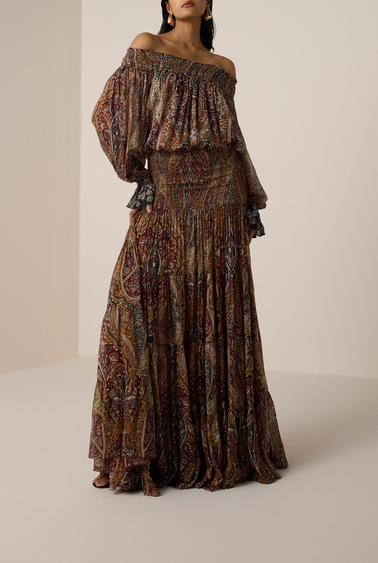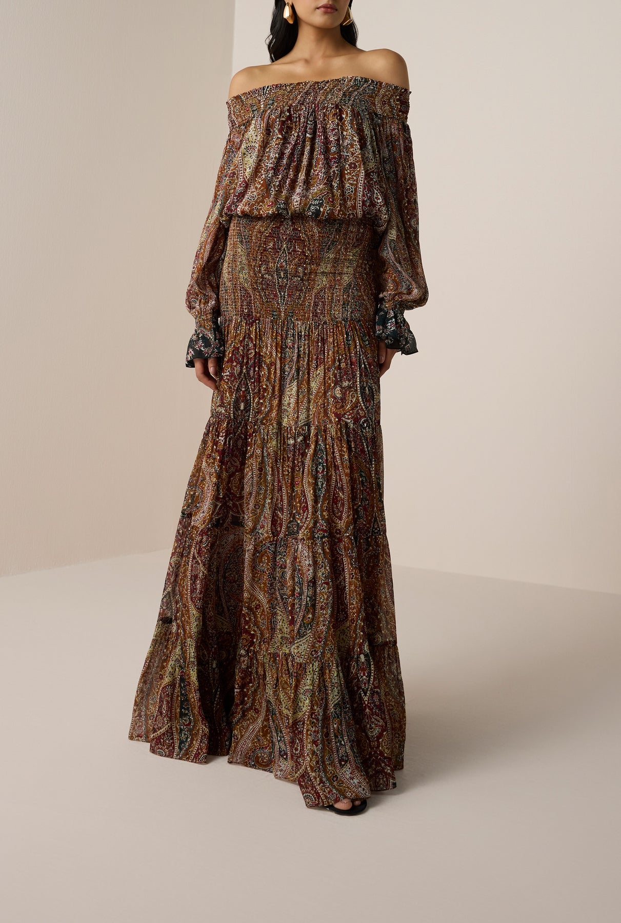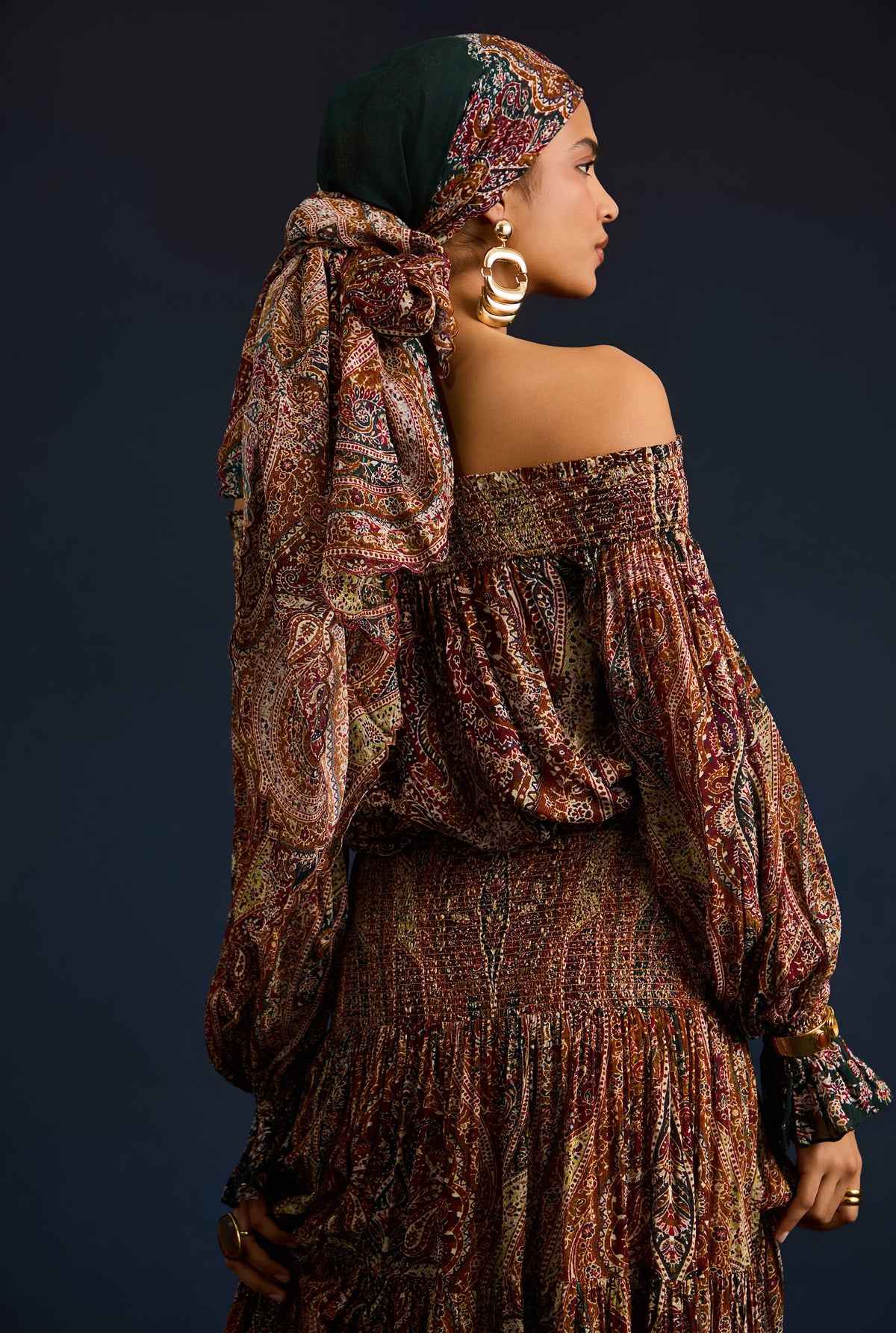 Subtly romantic, the Ruza Smocked Off-Shoulder Top from our Fall ’25 Collection is crafted in airy viscose chiffon and adorned with a heritage Jamawar print in rich, earthy greens. Designed with a flattering off-shoulder neckline, smocked bodice, and blouson sleeves with ruffled cuffs, this fully lined silhouette offers a soft structure with a relaxed charm. Slip it on with the matching Ruza Maxi Skirt for a head-to-toe fall statement that blends boho ease with timeless elegance.