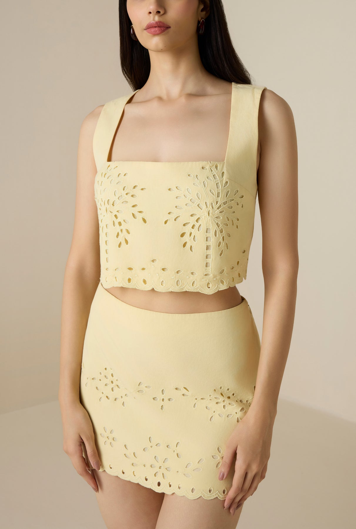 The Bagh Mini Skirt from the Resort ’26 collection pairs delicate craftsmanship with a clean, fitted silhouette. Crafted in powder yellow cotton and fully lined for comfort, it features intricate schiffli embroidery accented with palm motifs for that tropical vacay touch. Finished with a side zipper closure for a smooth look, this mini is a versatile piece that styles well with the Bagh Boxy Top.