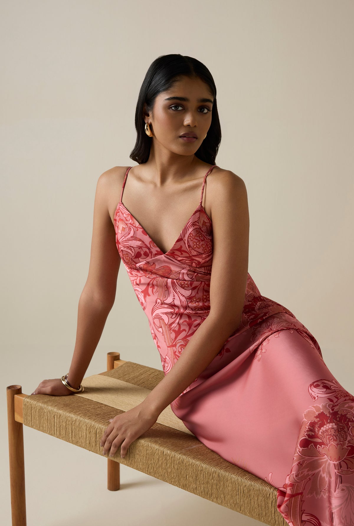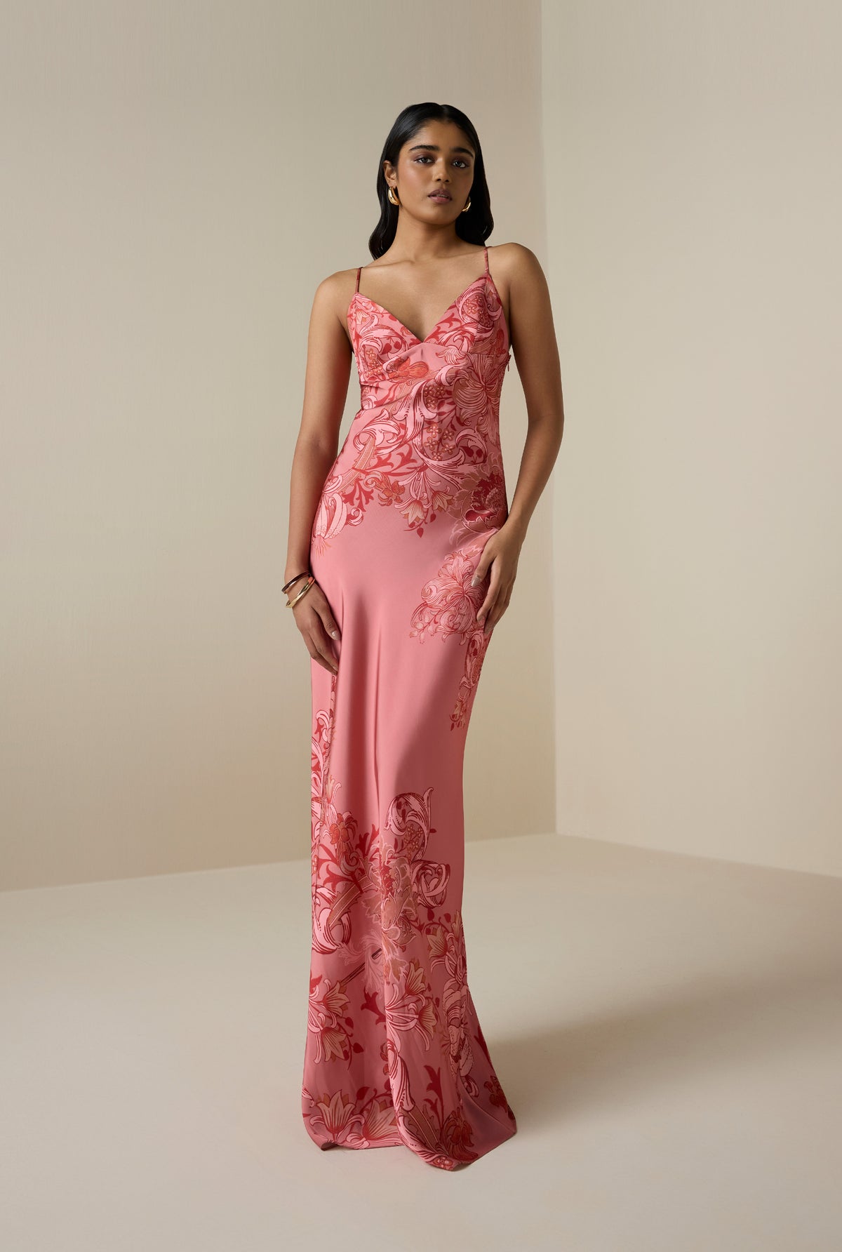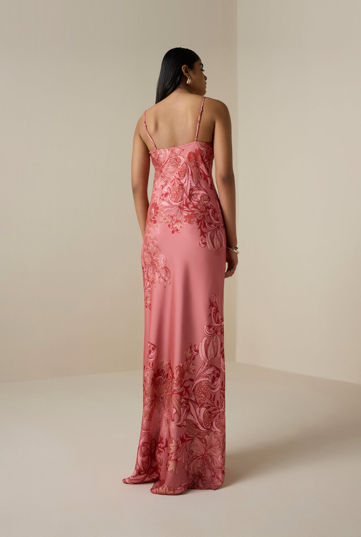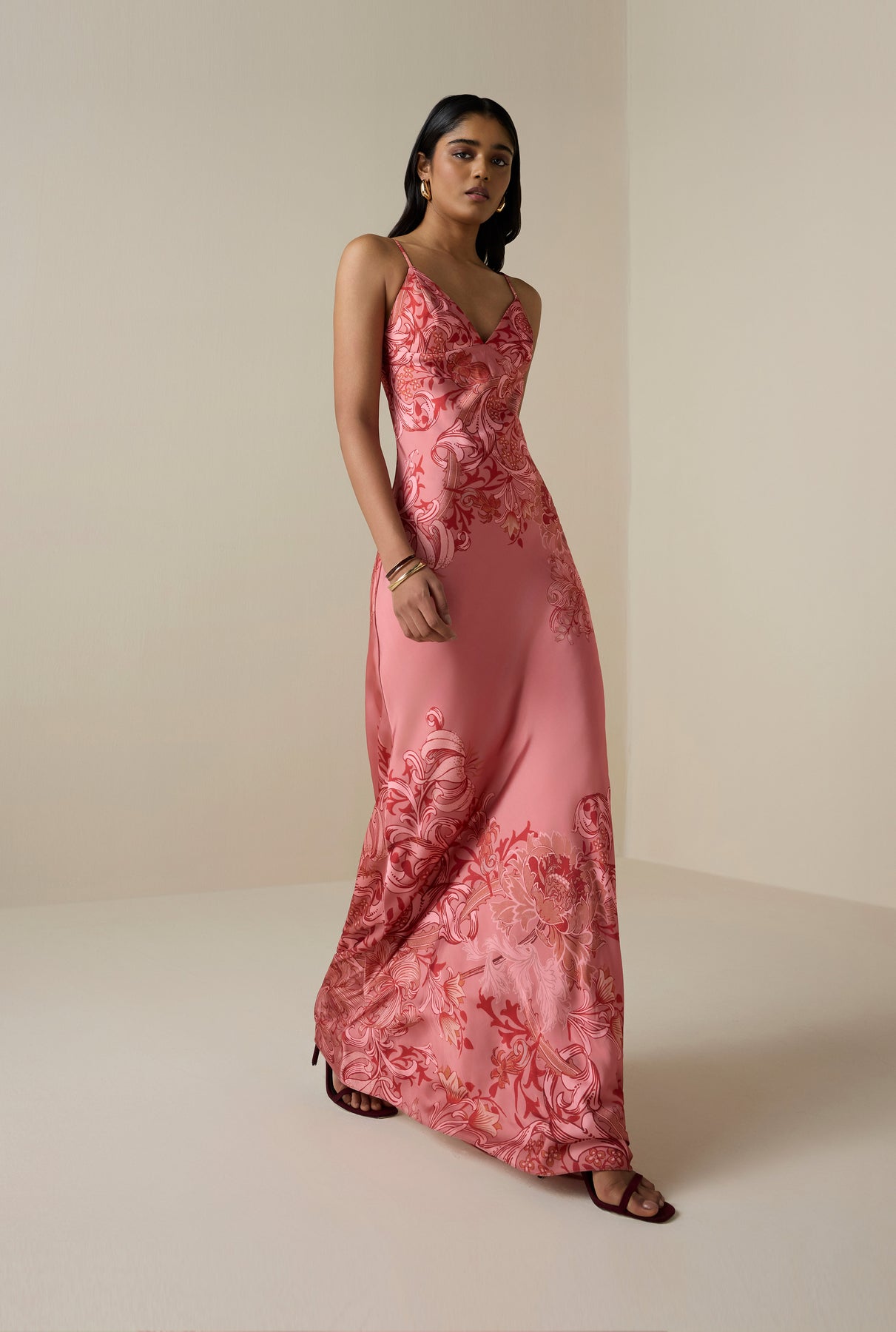 The Vine Maxi Dress from the Resort ’26 collection is a refined statement in fluid satin. Crafted in coral double polyester satin, it features a fitted silhouette accented with an abstract blooming floral print. The V-neckline and slender straps add a touch of delicacy, while the side zipper closure ensures a smooth, flattering fit. Elevated yet effortless, this maxi dress is perfect for sunlit soirees and elegant resort evenings.