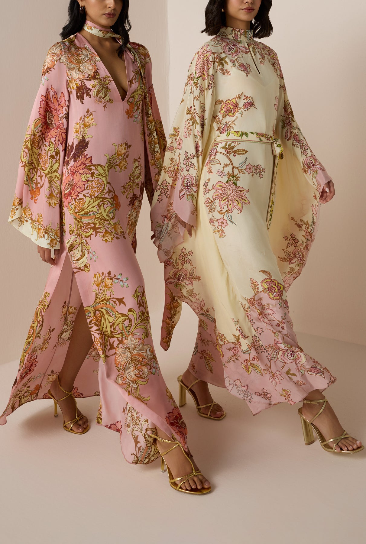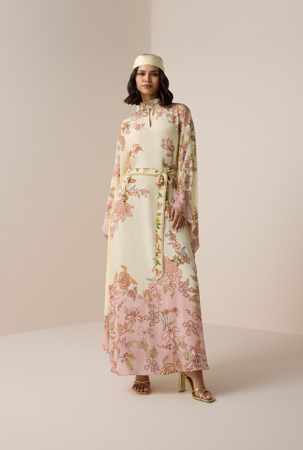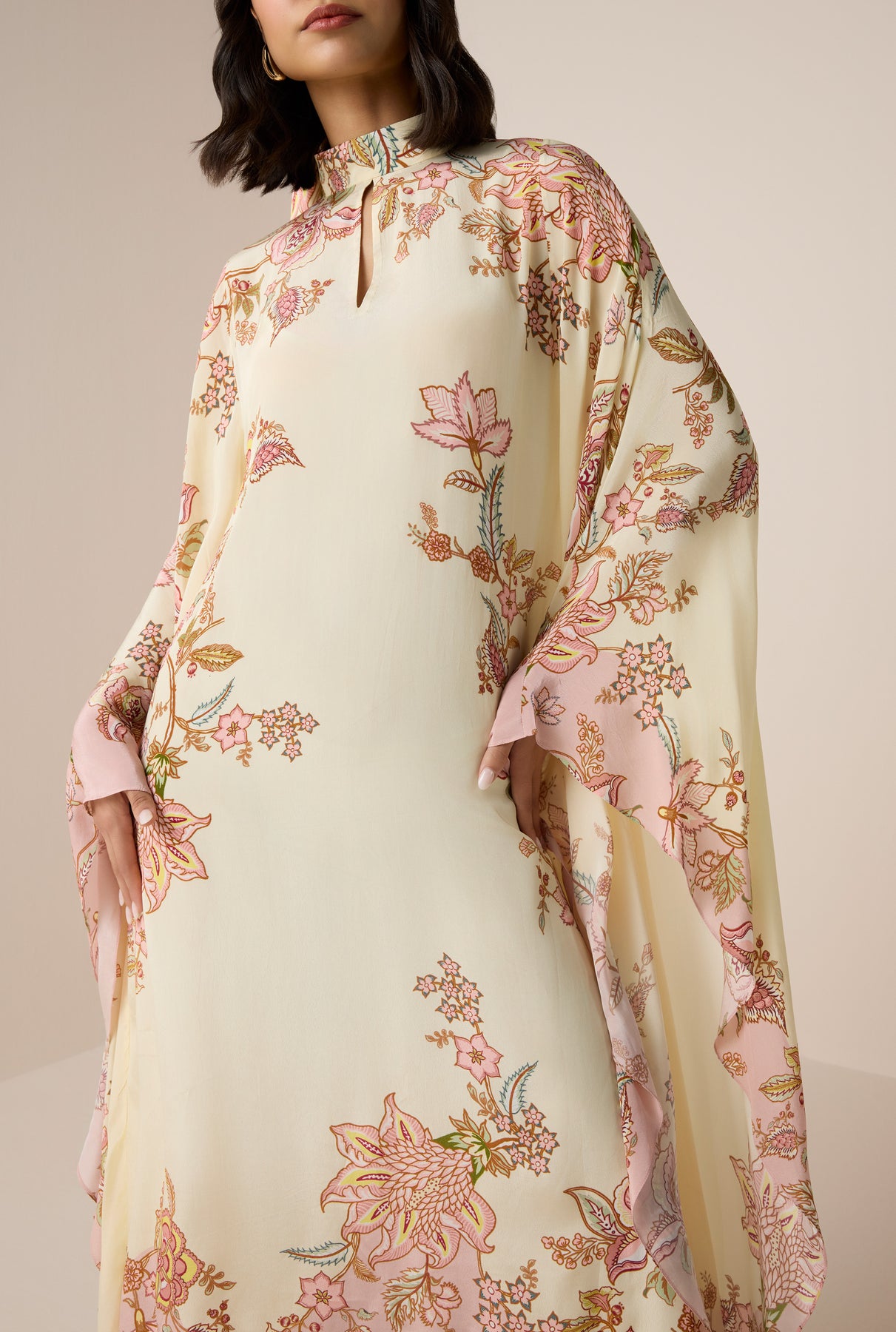 The Riah Kaftan from the Ramadan'26 collection is crafted in ivory viscose crepe, adorned with a delicate pink floral chintz print. Designed with a mock neck and elegant kimono sleeves, it features a keyhole button closure at the back and a relaxed, flowing fit. A slip provides added comfort, while a matching tie-up belt allows you to define the waist-making this kaftan a perfect blend of ease, femininity, and festive charm.