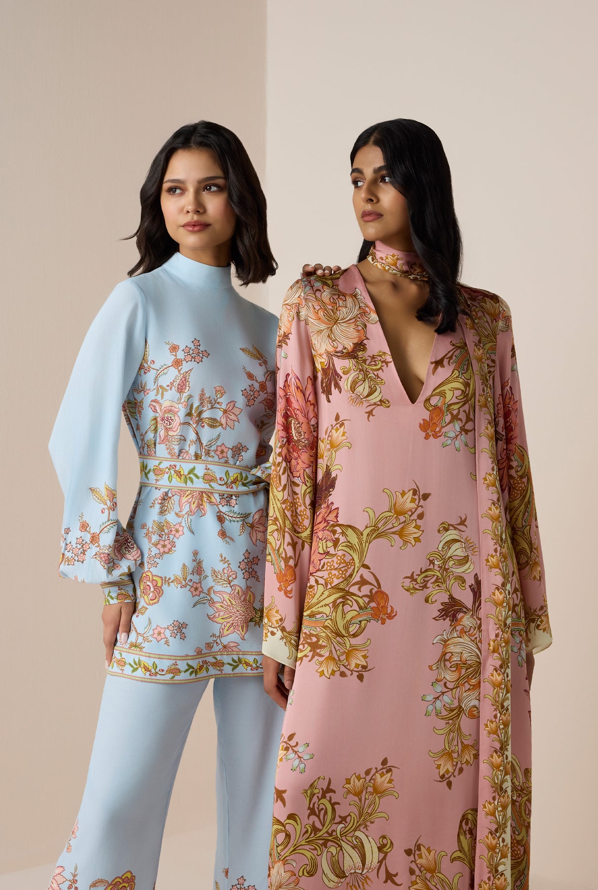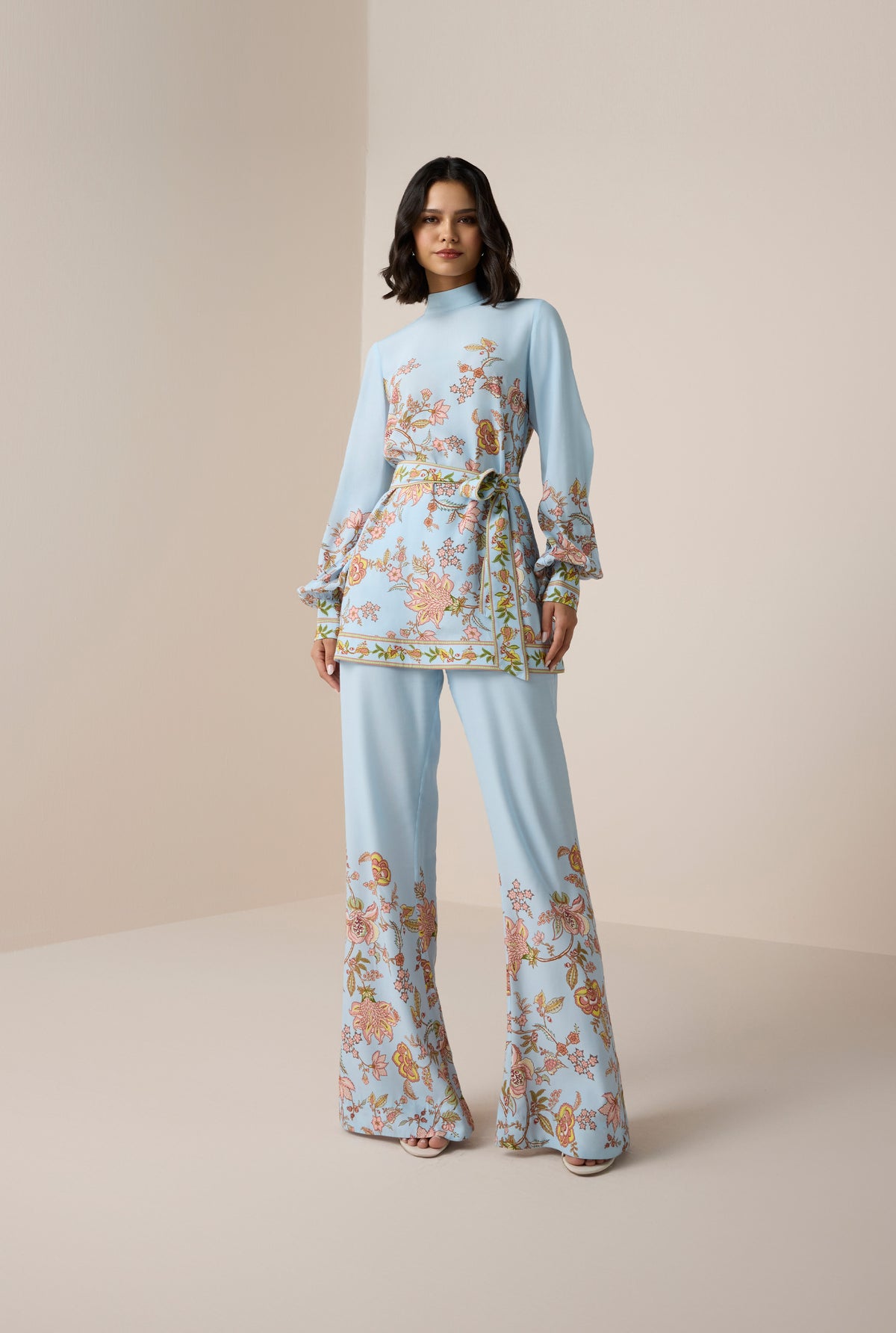 The Riah Pants from the Ramadan'26 collection offer a relaxed and stylish silhouette in powder blue viscose crepe, featuring a subtle chintz print. Designed for comfort and ease, they come with a side zipper closure and a flowing fit that pairs effortlessly with the matching Riah Top for a coordinated festive ensemble.