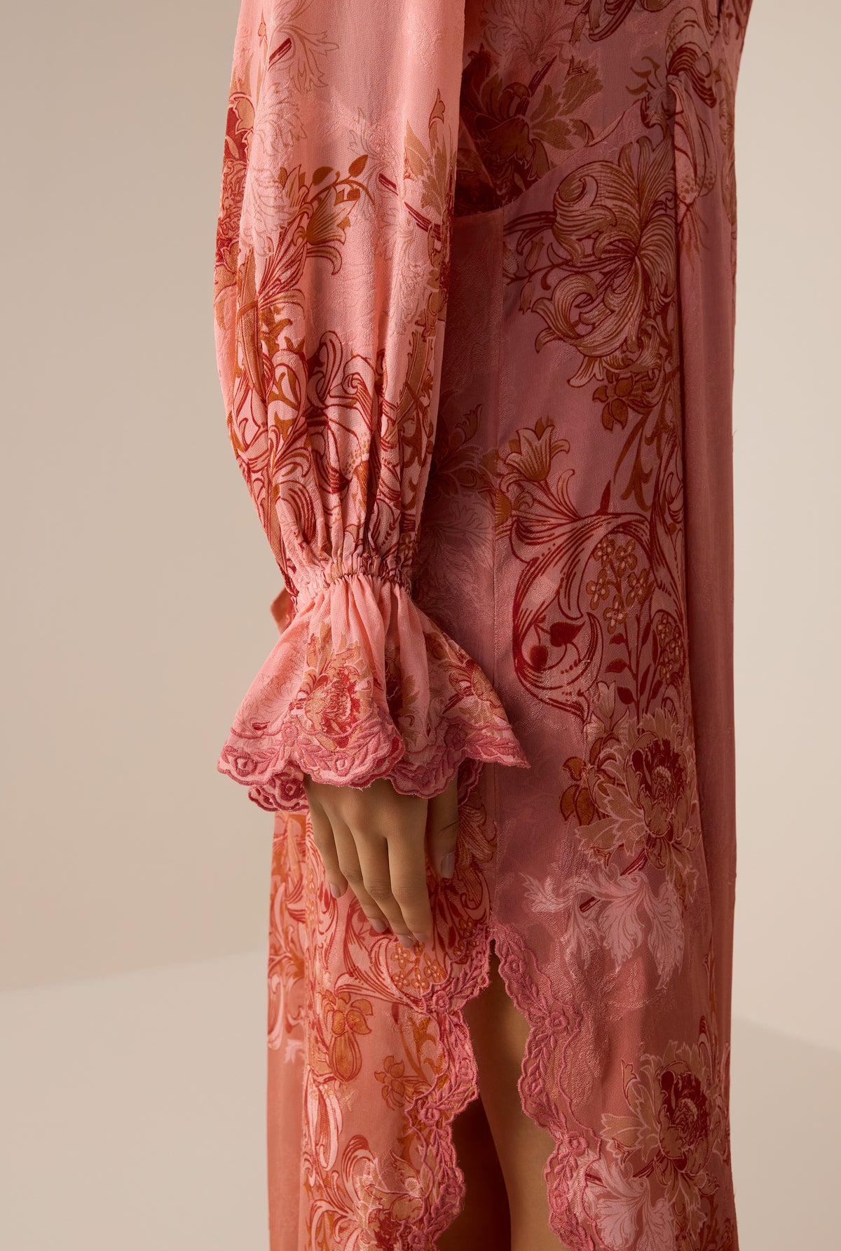The Vine Long Kaftan from the Ramadan'26 collection is crafted in coral viscose flower jacquard, offering a relaxed and flowing silhouette. It features a V-neck with a delicate bow tie, blouson sleeves with ruffles, and intricate scalloped embroidery along the bottom hem, sides, and sleeve edges. Accentuated with a blooming floral print and paired with a coordinating printed slip, this kaftan combines comfort with refined detailing.