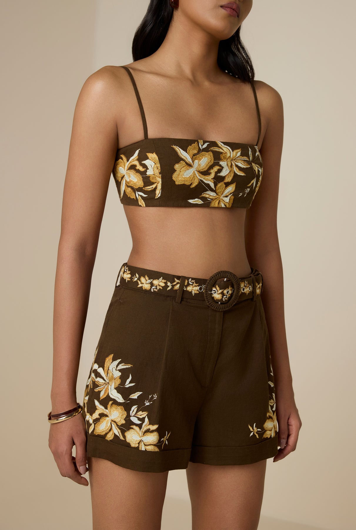 The Bota Bandeau from the Resort ’26 collection channels effortless sophistication through a modern, sun-ready silhouette. Crafted in a brown linen-cotton blend with delicate embroidery inspired by an orchid floral motif, it features a square neckline with thin straps and smocking at the back for ease and comfort. The fitted shape and side zipper closure lend a clean, structured finish.Perfect for pairing with the Bota Shorts or Bota Midi Skirt.