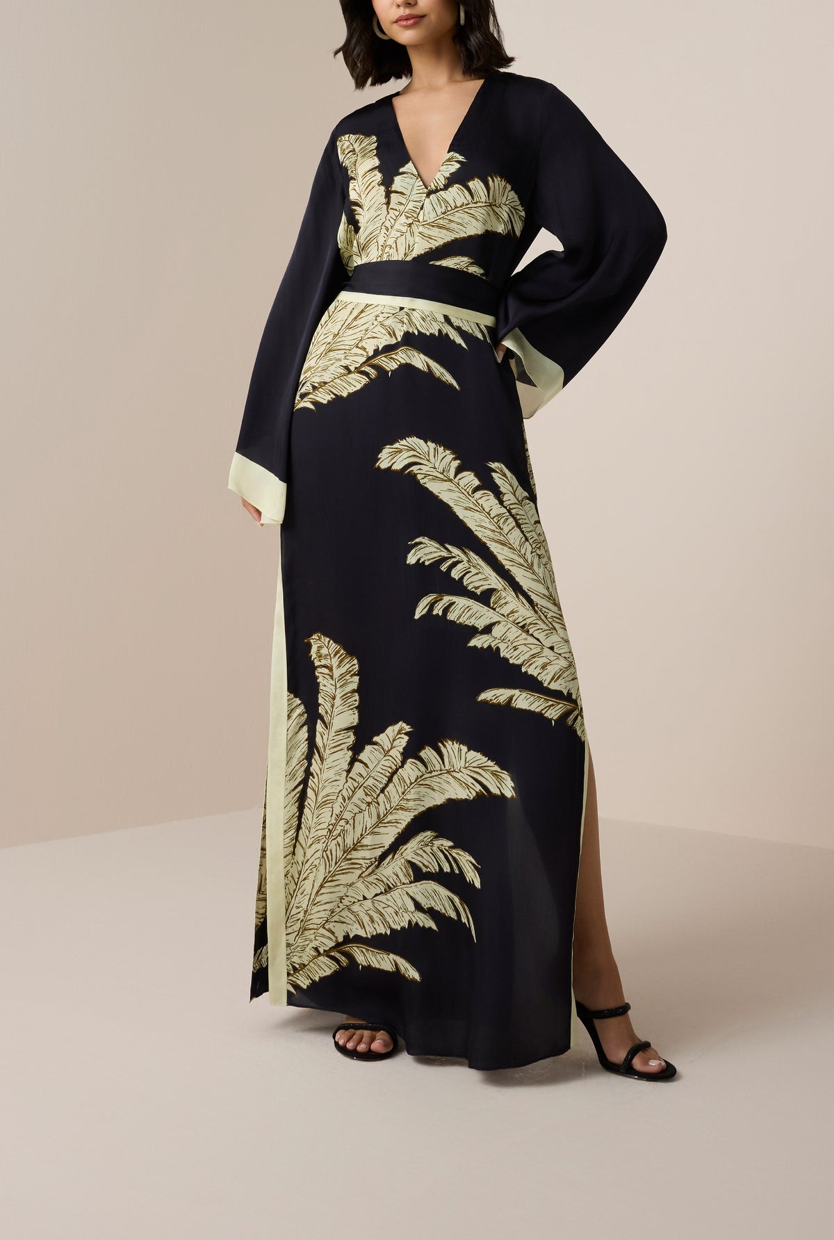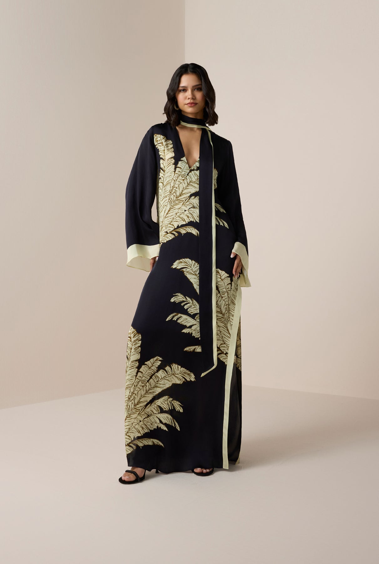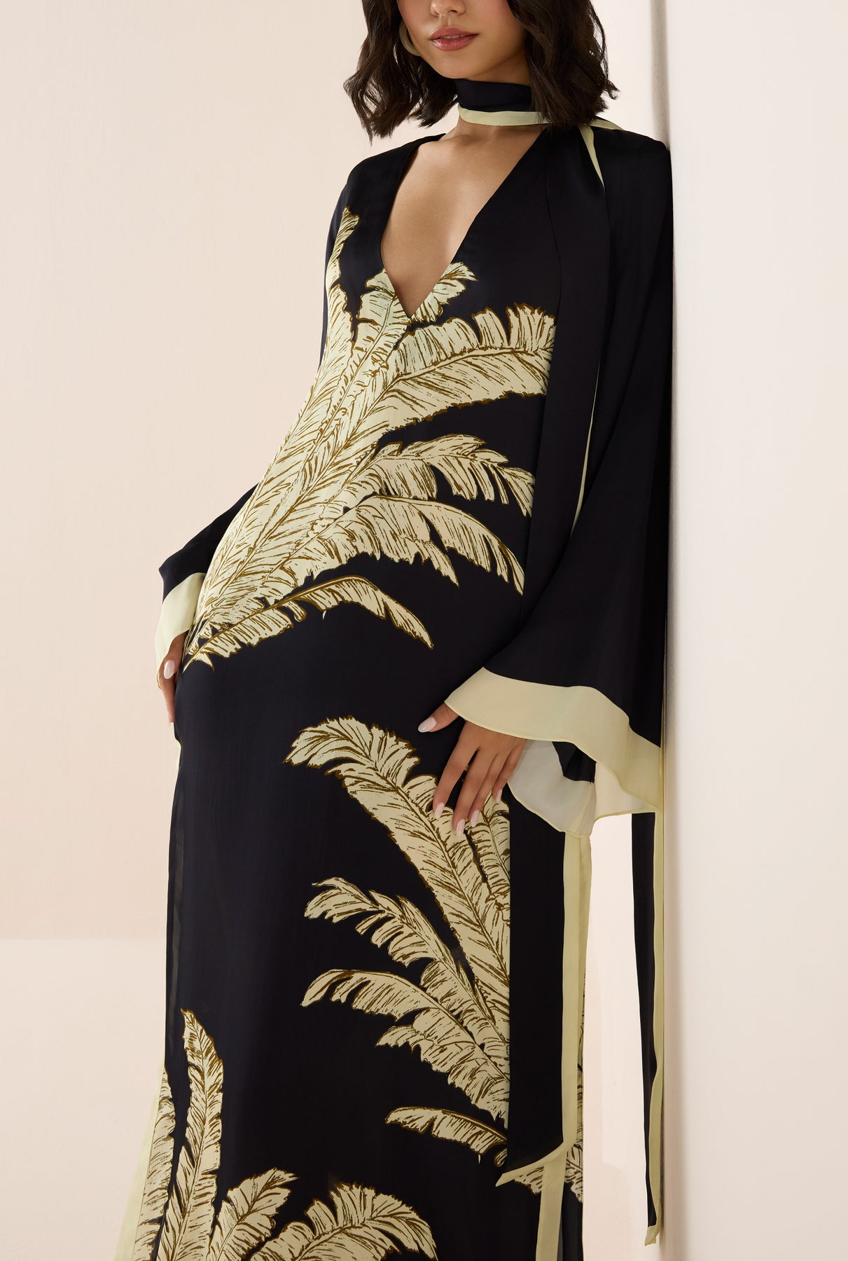 The Palm Belted Kaftan from the Ramadan ’26 collection is designed with grace and effortless charm. Crafted in fluid black viscose satin, it features a flowing silhouette with a V-neckline, slip-on ease, and full flared sleeves that lend a sense of poise. The signature palm print adds subtle artistry, while the tie-up belt allows for versatile styling. A timeless piece that balances modest elegance with contemporary appeal, it's perfect for Ramadan gatherings.