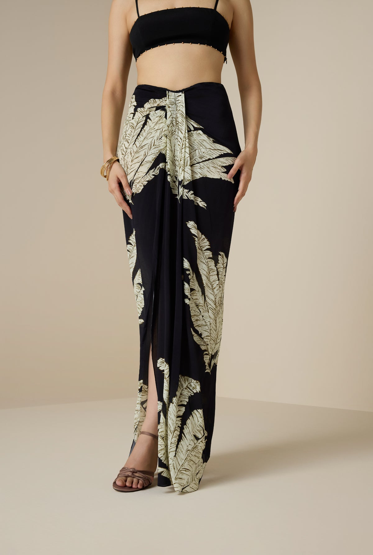 The Palm Maxi Skirt from the Resort ’26 collection is a statement style in black viscose crepe with a contrasting bold palm print. Designed to sit fitted at the hip, it falls into a fluid, draped silhouette that moves with ease. Finished with a sleek back zipper closure, this skirt offers a super relaxed touch, perfect for those leisurely sundowners! It's best paired with the Palm bandeau or the Palm Oversized shirt.