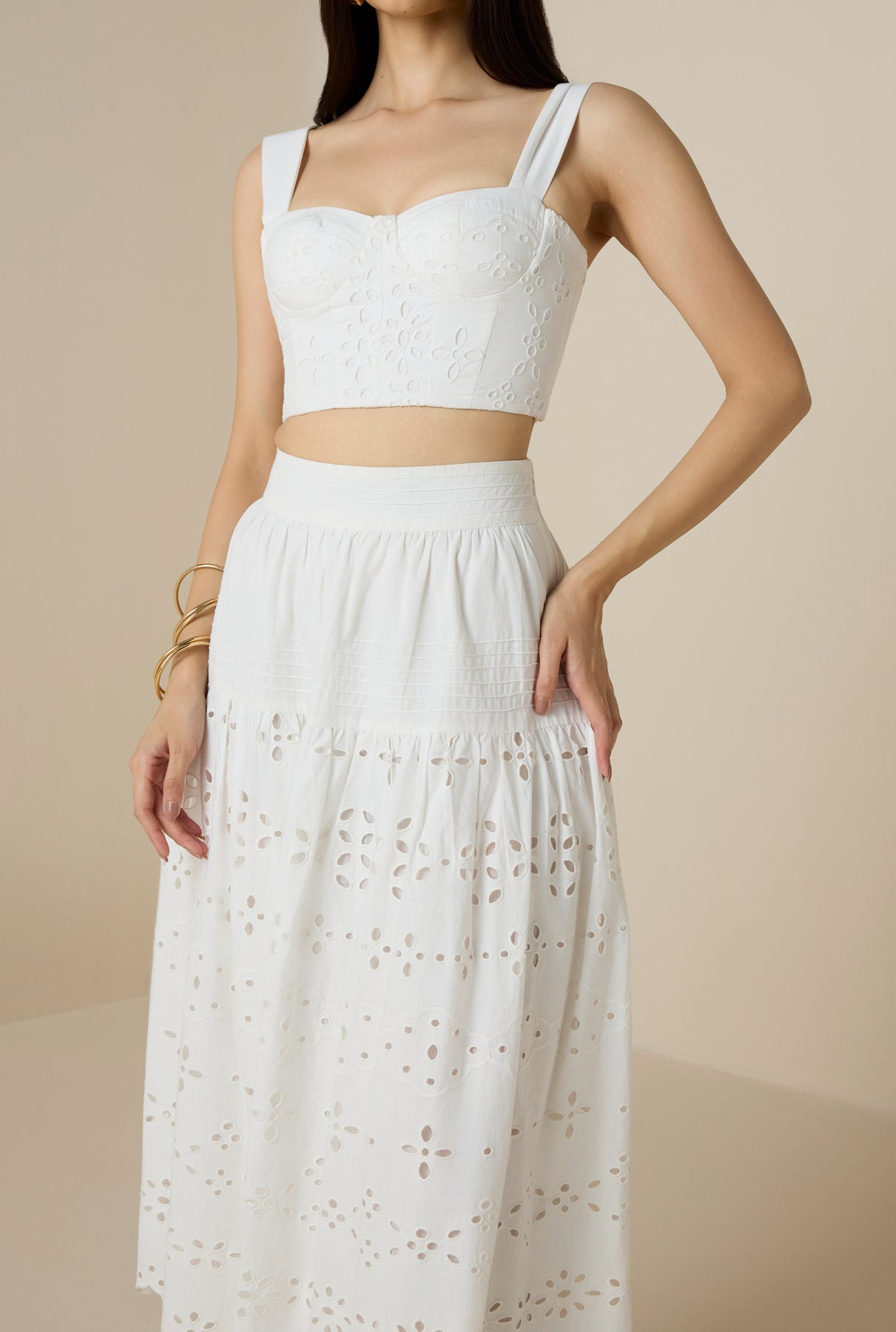 An effortless classic for warm-weather days, the Adya Midi Skirt from our Spring’25 Collection is crafted in breathable cotton schiffli with intricate cutwork embroidery. Designed with a wide waistband and delicate pintuck detailing, it falls into a voluminous flared silhouette with a scalloped hem for a feminine finish. Perfect for pairing with breezy tops, it transitions seamlessly from day to evening.