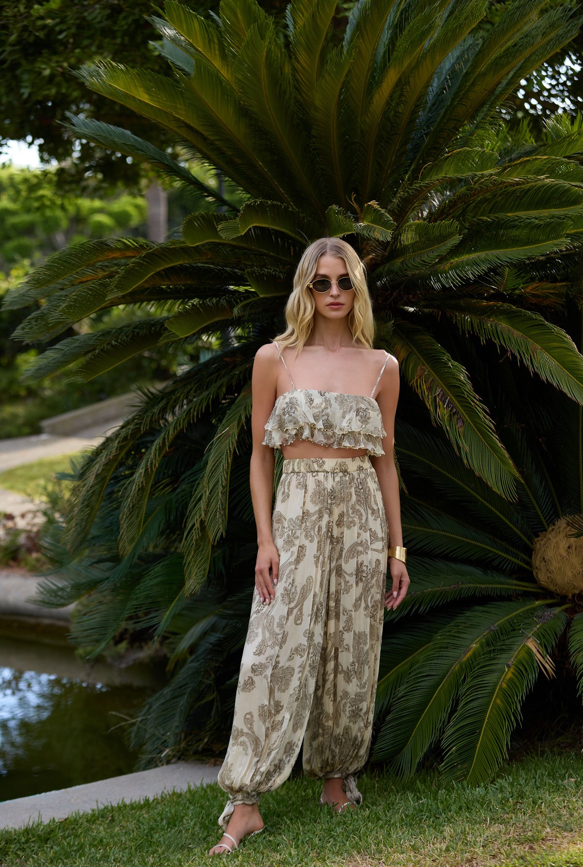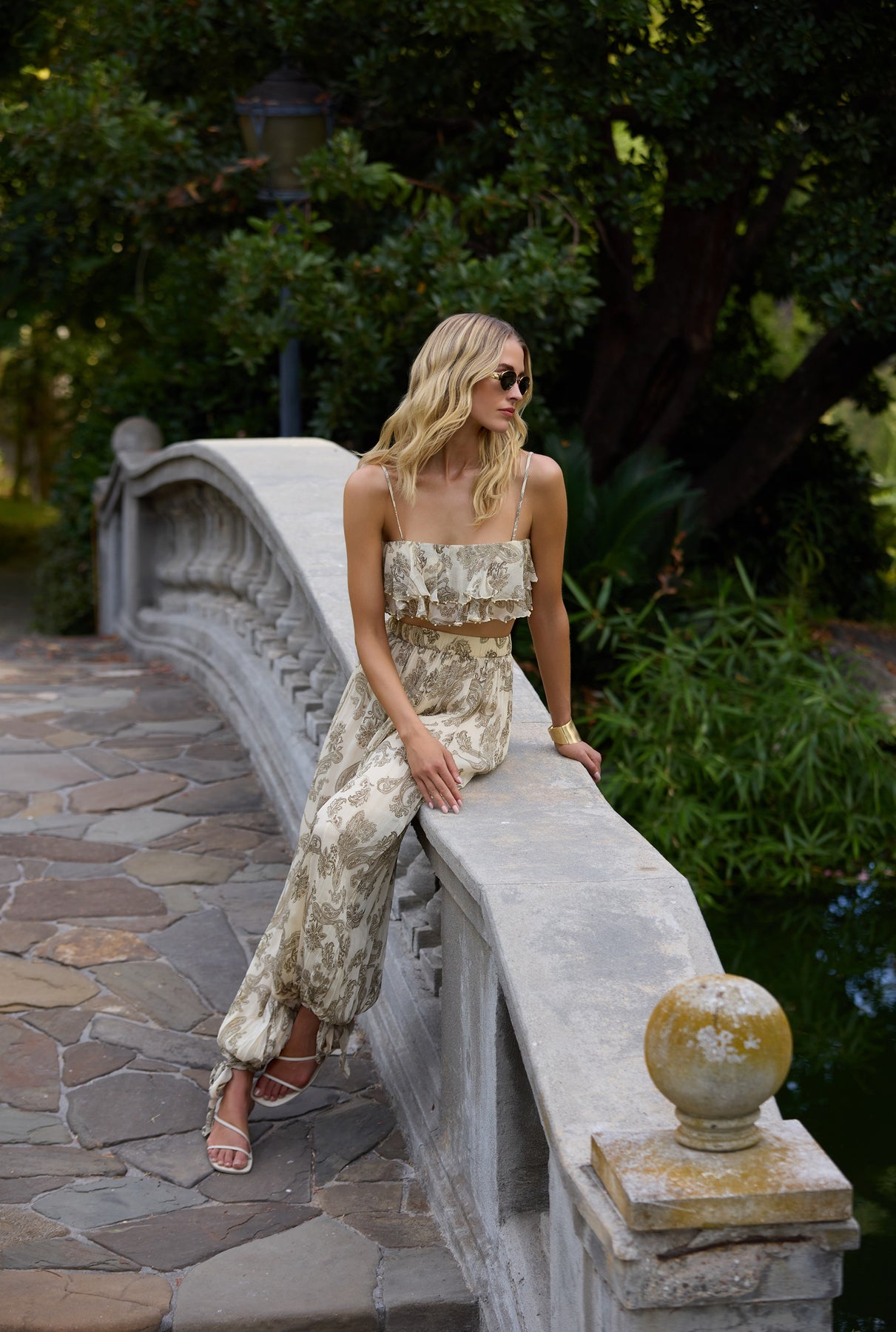 Dani Ruffle Top in ivory chintz, floral crinkle chiffon with square neckline and beaded ruffle detail. A romantic boho-chic style for spring occasions and pairs perfectly with the Dani Harem Pants.