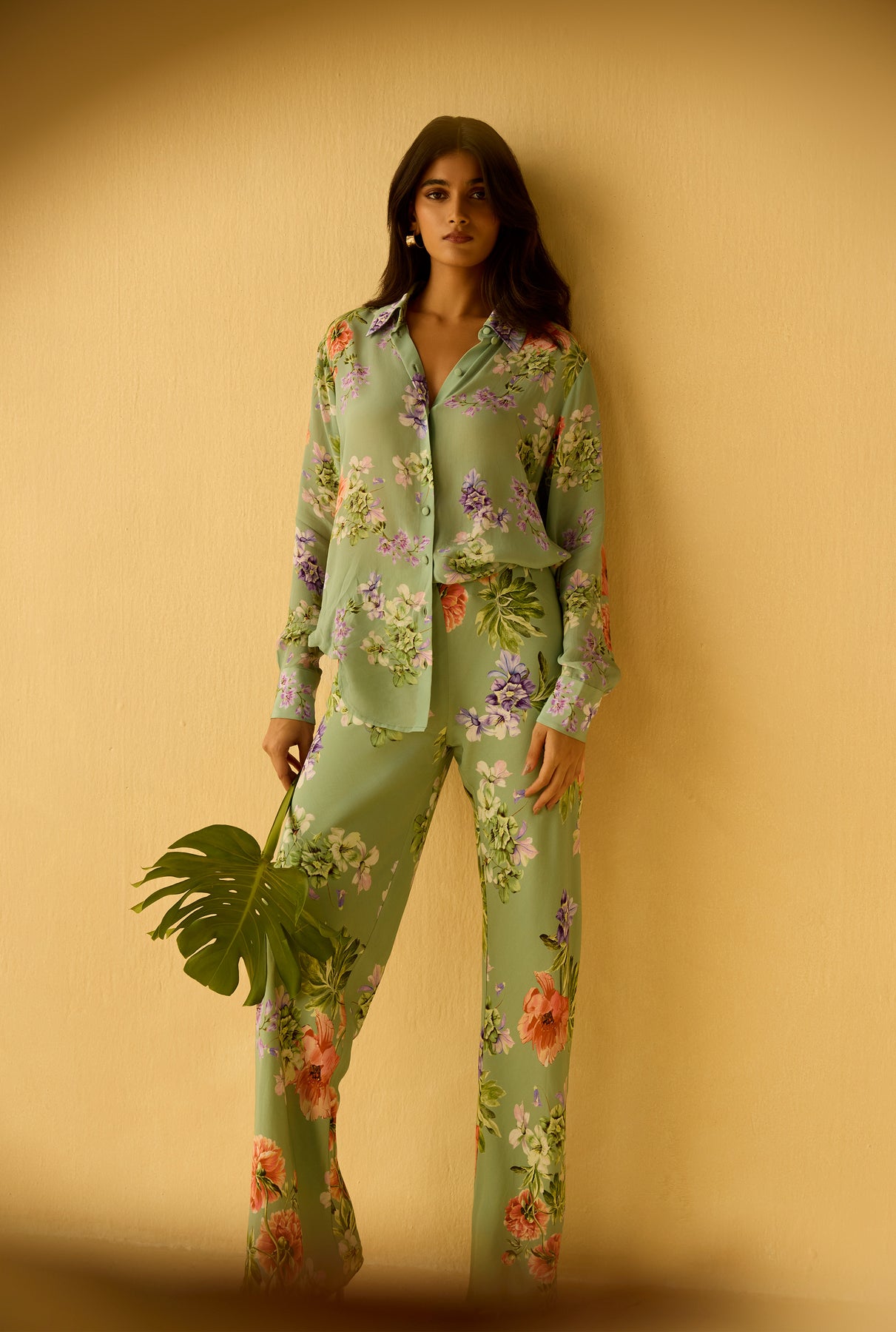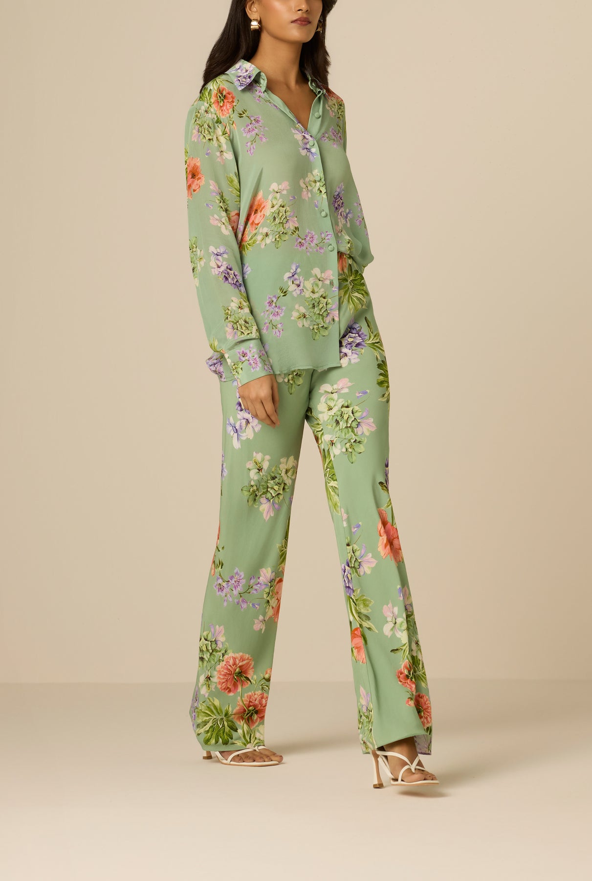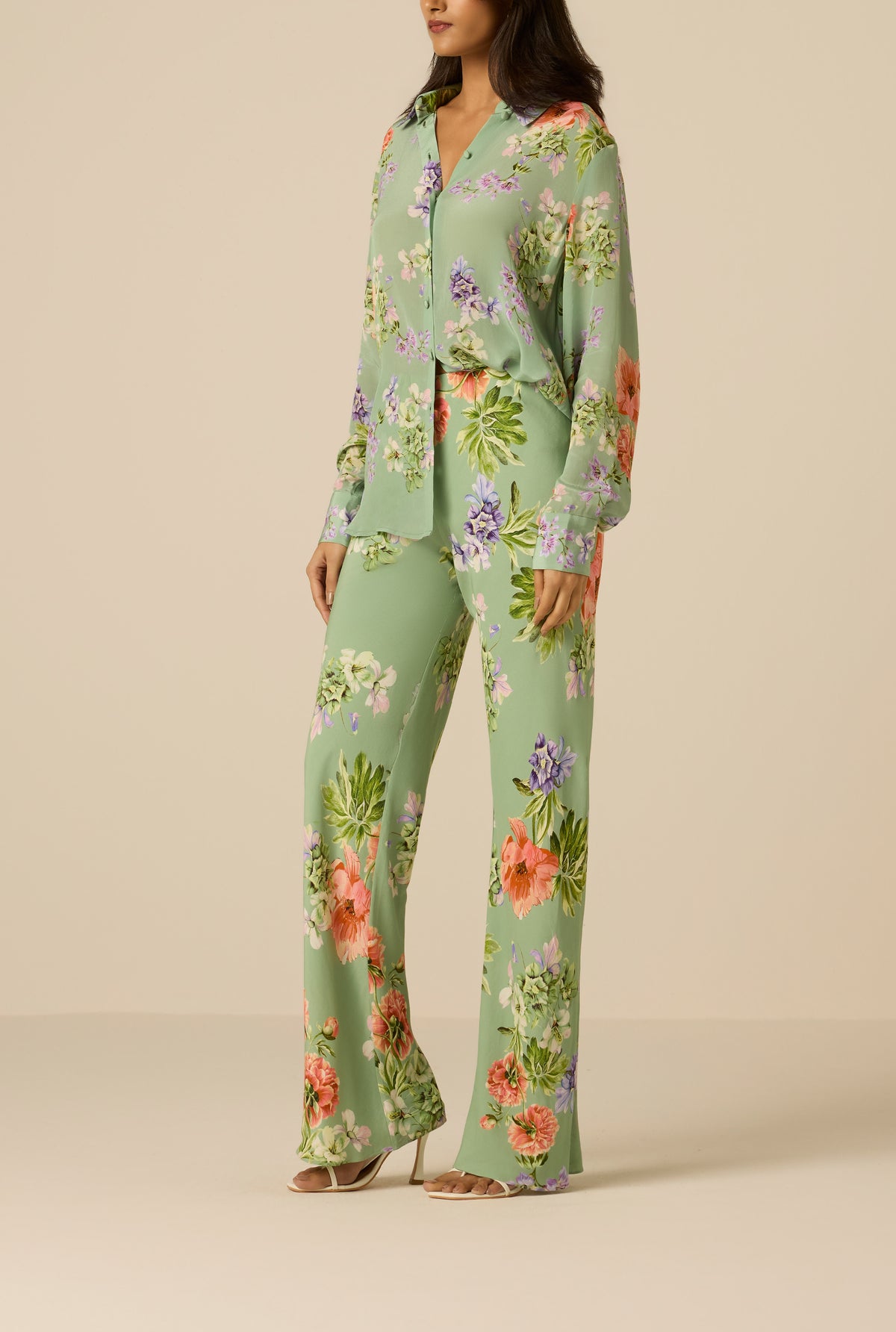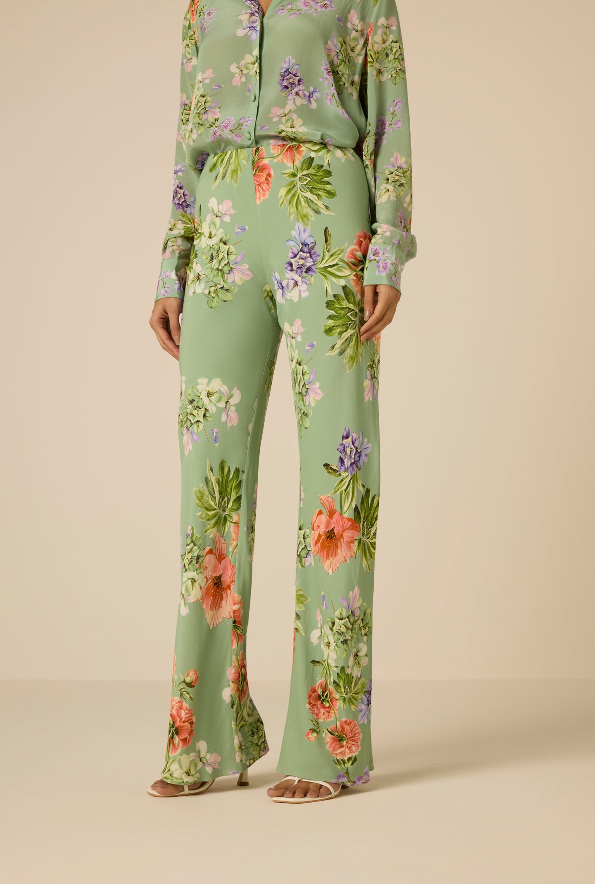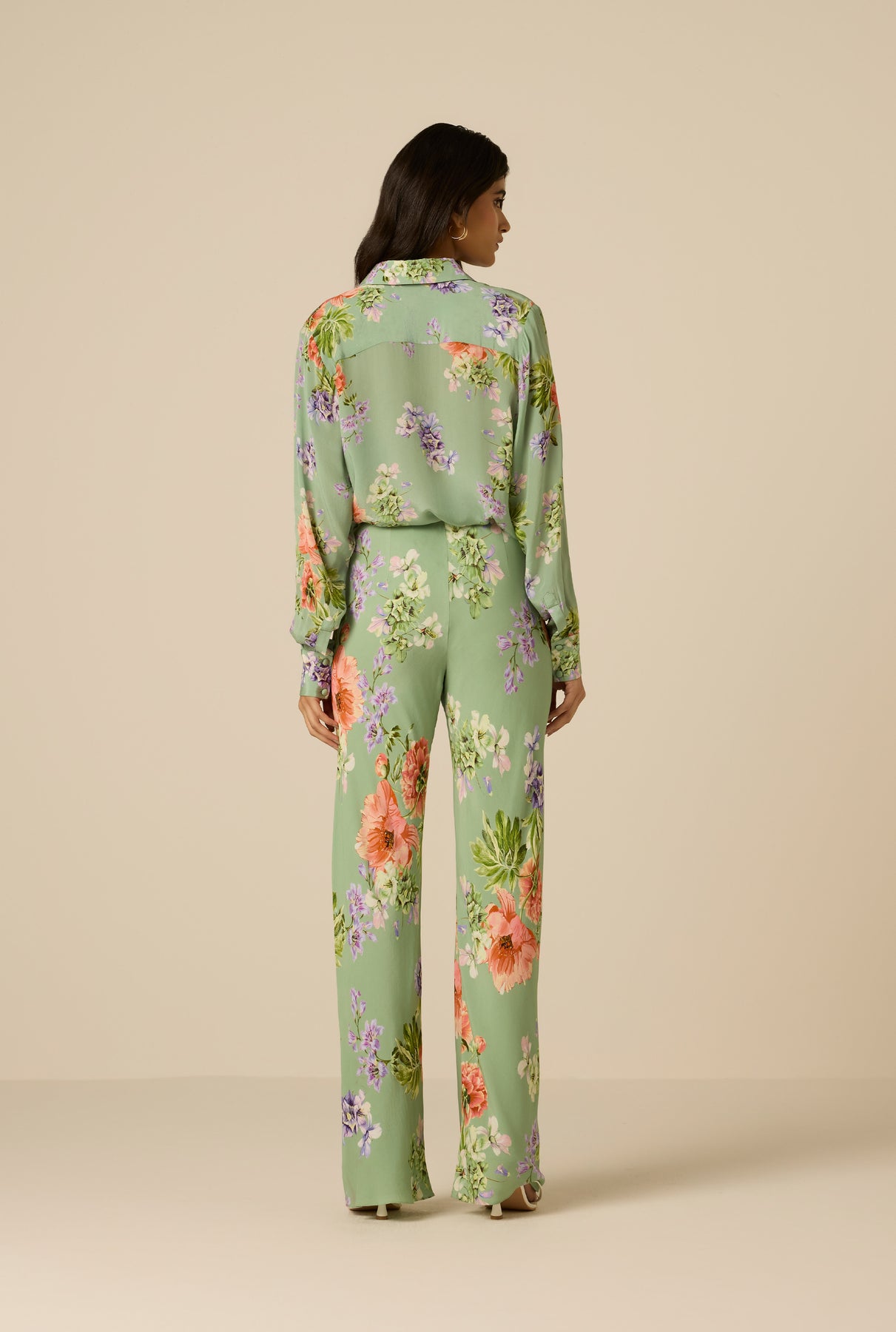 The Cove Bias Pants from the Spring ’26 Collection are crafted in green viscose crepe with a floral print. Designed in a relaxed silhouette with a mid-waist fit, they feature an elasticated waistband and pull-on construction for ease of wear. Fully lined for comfort, the bias cut enhances fluid movement while maintaining a soft, flattering drape. For that perfectly coordinated look, pair them with the Cove Oversized Shirt.