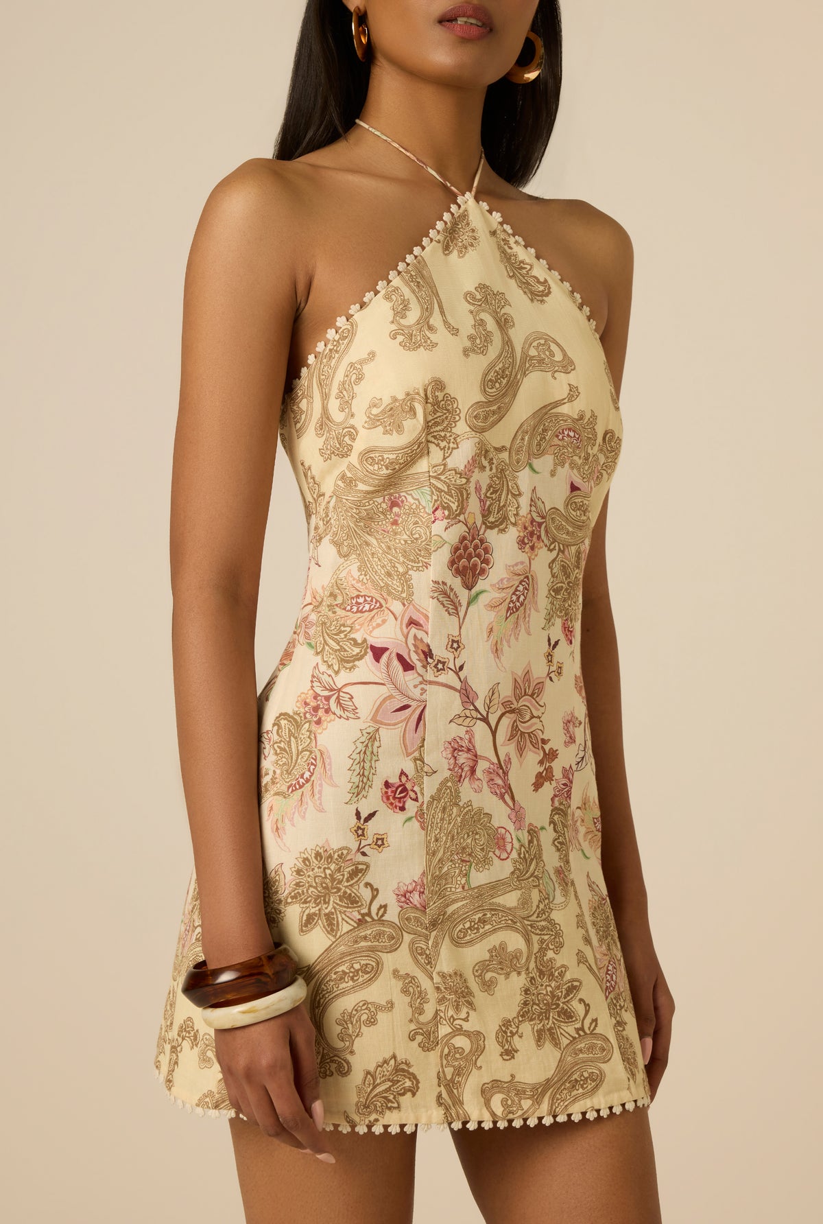 Romantic and sunlit in spirit, the Dani Short Dress from the Spring ’26 Collection captures the ease of a springtime escape. Crafted in a breathable linen-cotton blend in an ivory chintz floral print, the fitted silhouette is shaped with a halter neckline that ties at the back. Delicate lace trim and tassel detailing add texture, lending a subtle boho-chic charm. A concealed back zipper and full lining ensure a smooth, comfortable fit.