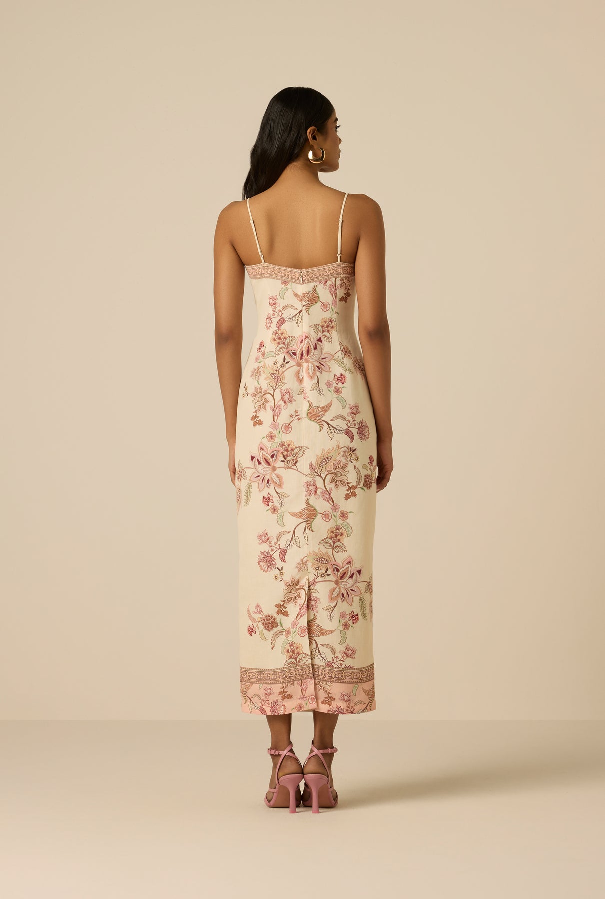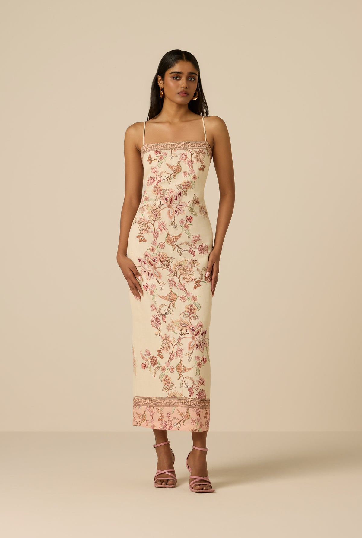Softly structured and feminine, the Dani Strappy Midi Dress from the Spring ’26 Collection is crafted in a breathable linen-cotton blend in an ivory chintz floral print. Designed in a fitted silhouette, it features a clean square neckline framed by delicate, thin straps. A concealed back zipper ensures a seamless finish, while full lining adds comfort.