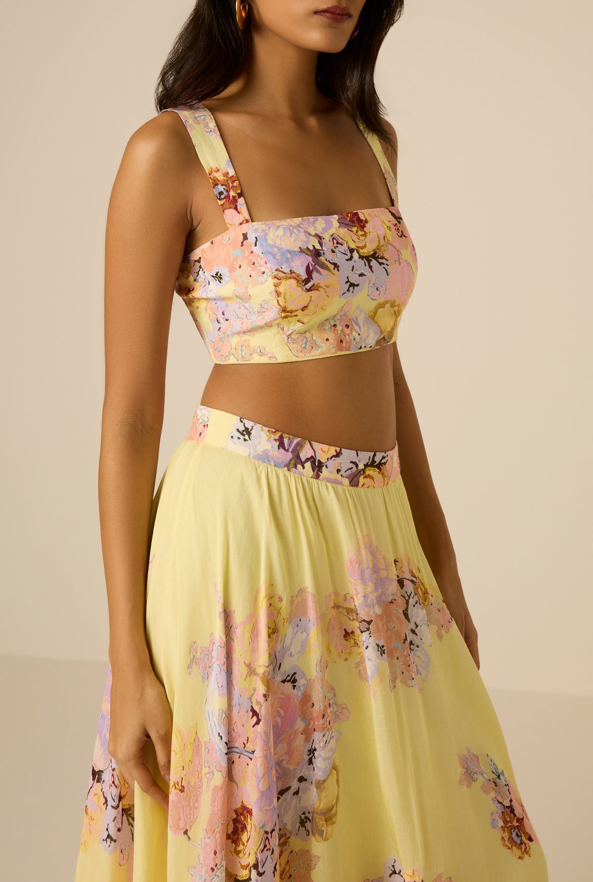 The Kysha Corset Top from the Spring ’26 Collection is tailored in a viscose organza and linen blend with a yellow abstract floral print. Designed for a close fit, it features a square neckline, wide straps, and corset-inspired seaming that shapes the bodice. A concealed side zipper allows for a smooth, secure finish, while full lining ensures comfort and ease of wear. Best paired with the Kysha Midi Skirt